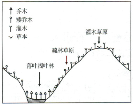 (2025南京一中月考)某生态脆弱区实施了大规模退耕还林还草工程,大范围坡耕地转为林草地。下图示意该地区自然状态下某地自谷底到顶部植被分布(如下图所示)。据此完成3~5题。