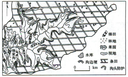 (2025无锡月考)黄土高原水土流失治理的早期,造林需要有工程措施改善自然条件,提供适生环境。该地某小流域有宽广而平坦的塬面,经过多年的水土流失治理,塬面条田连片,沟坡林草茂密,沟底坝库相连。下图为“该小流域塬面附近综合治理示意图”(如下图所示)。据此完成6~8题。