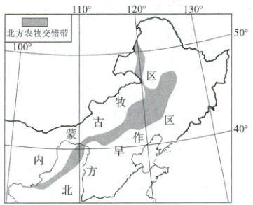 (2025盐城五校联盟月考)农牧交错带是指农区与牧区的过渡地带。下图示意我国北方农牧交错带分布(如下图所示)。据此完成1~2题。