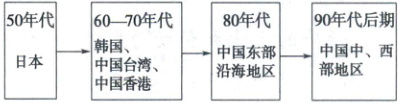 下图示意20世纪下半叶,东亚地区产业转移的主要对象国家和地区的变化(如下图所示)。