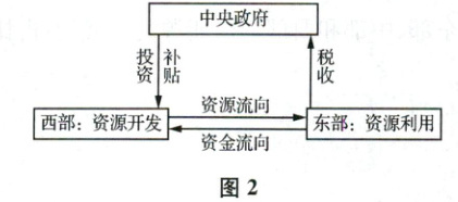 材料二 紫气东来,绿色管道开工,总揽金局发展,东西双赢。图2为“西气东输’的区城协调效应图”(如下图所示)。
