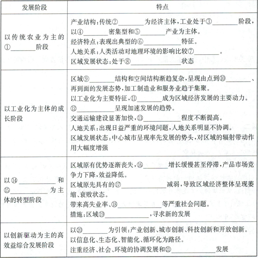 (7)①初级 ②农业 ③起步 ④劳动 ⑤资源型 ⑥自给自足 ⑦微弱 ⑧低水平的均衡 ⑨产业 ⑩线 ⑪工业化 ⑫第三产业 ⑬区域开放 ⑭结构优化 ⑮整体提升 ⑯经济 ⑰集聚效应 ⑱人口减少 ⑲产业调整 ⑳创新 ㉑可持续