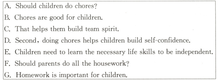 First, doing chores helps children learn to be independent(独立的). Parents can’t stay by their children’s side all the time. 2 And these skills will help them be ready for the day when they go to college or take care of their own houses.