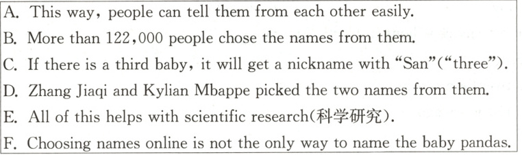 There were five different pairs of names on the zoo’s website for people to pick. 1 The names stand for friendship between France and China, as well as a wish for the babies’ good health. Pandas usually have two names, a nickname(乳名) and an official name. The nickname is for baby pandas. 2 If there are twin baby pandas, the older one gets a nickname with the character “Da” and the younger gets a nickname with the character “Xiao”. They mean “older” and “younger” in Chinese. For example, the panda “Jinging” gave birth to twins. The older one would be nicknamed “Jingda”, while the younger would be “Jingxiao”.