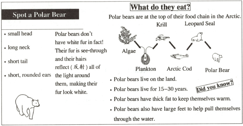 )3. What can we learn from the picture?A. Polar bears have white fur all over the body.