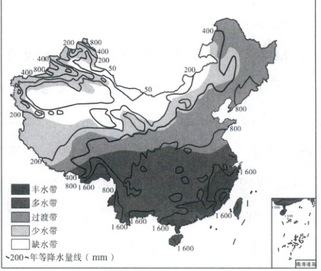 淡水资源是现代社会所必需的战略资源,淡水资源严重短缺导致的资源安全问题,能够动摇国家经济社会发展的物质基础。下图为“我国水资源空间丰缺度分布示意图”。据此完成1~2题。