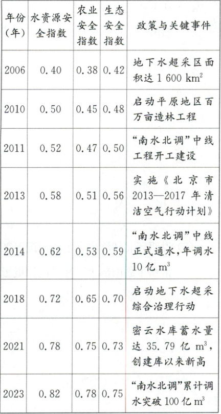 (2)根据材料可知,安全指数从0.62(2014年)快速上升至0.82(2023年),由“较不安全”提升至“安全”等级;随着科技发展,节水技术不断进步,生产生活用水效率提高,减少了水资源压力;“南水北调”工程2014年通水后年调水10亿m³,2023年累计调水超100亿m³,直接补充水资源;2018年启动地下水超采治理,2021年密云水库蓄水量创新高(35.79亿m³),提升供水稳定性;2010年百万亩造林工程、2013年清洁空气行动计划改善水循环,增强生态蓄水能力。