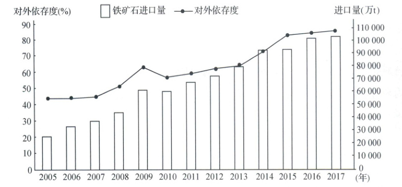 材料一 铁矿是生产钢铁的主要原料,其供给直接关系到国家安全。我国是钢铁工业大国,也是铁矿消费大国。我国铁矿储量仅次于俄罗斯、澳大利亚、巴西和加拿大,居世界第五位。但我国铁矿贫矿多富矿少,每年不得不进口大量铁矿石,对外依存度长期居高不下。下图为“我国铁矿石进口量和对外依存度示意图”。