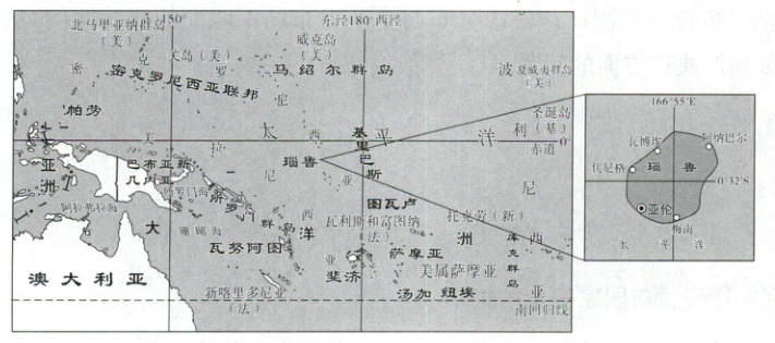 材料二 地处太平洋西部的瑙鲁,面积21.1$km^2$,人口约1万。这个小岛是海鸟的天堂,鸟粪长期累积形成磷酸盐矿。瑙鲁磷酸盐资源丰富,80%的地表都曾覆盖着磷酸盐矿,有的厚达10m。出口磷酸盐矿是该国财政收入的主要来源。下图为“瑙鲁地理位置图”。