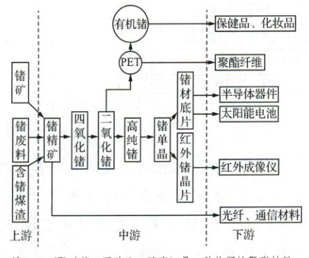 我国锗产量全球占比83.2%,居世界首位。锗原料主要来源于褐煤锗矿、铅锌冶炼产业的副产品等,下图示意锗产业链。锗广泛应用于半导体、信息科技、国防军工等领域,成为战略性关键金属资源。自2023年8月1日起,我国对锗相关物项实施出口管制。据此完成5~7题。