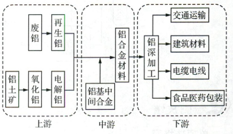 (2025扬州期中)我国是铝产品生产与消费大国,但铝资源高度依赖进口。近年来我国企业联合国内外采矿、冶炼、物流、基建等企业进行铝土矿海外投资,构建“生产+物流+基建”的合作模式。下图为“铝产业链示意图”。据此完成8~9题。