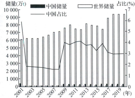 当前,我国在全球镍资源产品价值链中所处地位逐渐上升。如图(见下页左栏上图)示意2001—2020年中国、世界镍资源储量。据此完成10~12题。