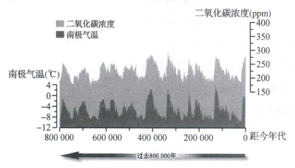 (2)描述近 80 万年来大气中二氧化碳浓度变化与南极地区气温变化的关系。