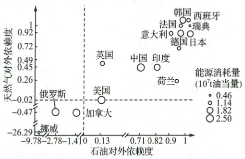 下图示意泛北极国家(部分)能源消耗量及对外依赖度。据此完成 8~9 题。