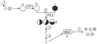 注:$ EBV$ 转化细胞能够在选择培养基 $ X$ 中存活,但对乌本苷敏感,骨髓瘤细胞在选择培养基 $ X$ 中不能存活,对乌本苷不敏感。①~⑤代表相关过程,$ a$~$ g$ 代表相关细胞
