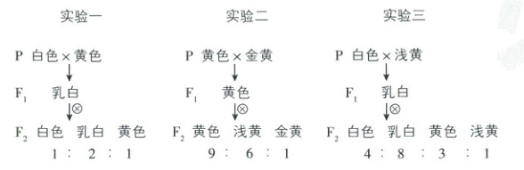 (3)实验三中F₂的性状分离比为白色:乳白:黄色:浅黄=4:8:3:1,为9:3:3:1的变式,该比例说明相关性状受两对等位基因控制,结合实验一的结果可推测,实验三F₁的基因型为DdGgHH,表现为乳白色,因此亲本白色个体的基因型为DDGGHH。