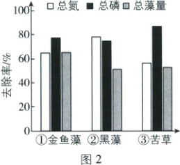 (3)分析图2可知,3种沉水植物可通过吸收水体中的N、P等营养物质,以降低水体富营养化程度;与浮游藻类竞争阳光等,抑制藻类大量繁殖,达到抑制水华发生的效果;通过光合作用产生氧气,提高水体溶氧量,为分解者提供氧气,增加微生物分解有机物的能力;使颗粒物沉降,提高水体透明度。