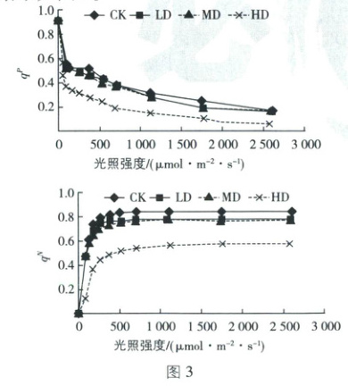 (4)研究表明干旱也会引起光抑制,降低黄连产量,研究人员研究了干旱对$q^{p}$ 和$q^{N}$ 的影响,分为 CK(正常水分)、LD(轻度干旱)、MD(中度干旱)、HD(重度干旱)四组,结果如图 3。