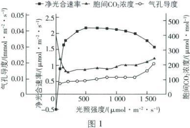 (1)分析图1,光照强度大于500μmol·m⁻²·s⁻¹后,随光照强度增加,气孔导度增加,CO₂吸收增多,但净光合速率降低,固定的CO₂减少,最终导致黄连叶片胞间CO₂浓度增加。