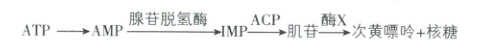 [深度解析]ATP、AMP中都含有腺苷和磷酸,AMP是RNA的基本单位,ATP需要水解掉两个磷酸基团才能形成AMP,A错误;ATP在细胞中含量很少,但与ADP之间的转化很迅速,IMP的生成不需要ATP提供能量,B错误;腺苷脱氢酶、ACP、酶X都能降低化学反应的活化能,C错误;IMP具有鲜味特性而次黄嘌呤和核糖无鲜味,在IMP降解前有效抑制ACP的活性是鱼肉保持鲜味的思路,D正确。