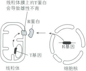 题图解读玉米细胞质中T基因导致雄性不育,显性核恢复基因(R基因)可表达R蛋白,R蛋白与线粒体膜上的T蛋白结合后可使植株恢复育性。T(Rr)的玉米自交,后代约有$\frac{1}{4}$为雄性不育T(rr)个体。