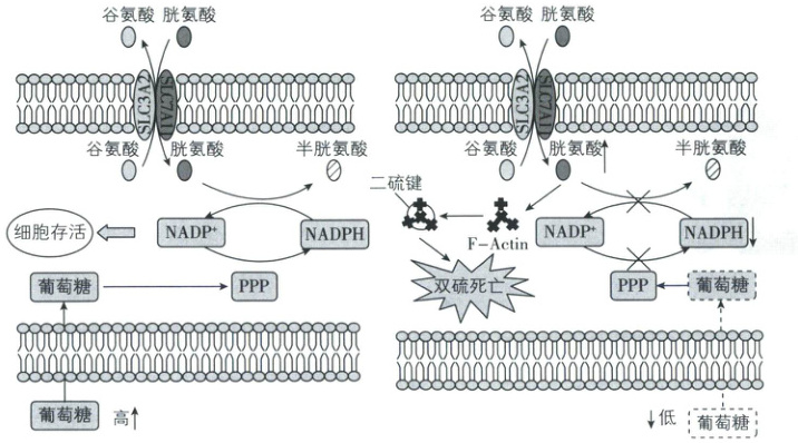 信息提炼葡萄糖含量高时,促进NADP⁺与NADPH相互转化,NADP⁺促进细胞存活,同时胱氨酸转化为半胱氨酸。葡萄糖含量低时,抑制NADP⁺与NADPH相互转化,抑制胱氨酸转化为半胱氨酸,同时过量胱氨酸积累引起二硫化物应激,最终导致细胞膜破裂而死亡。