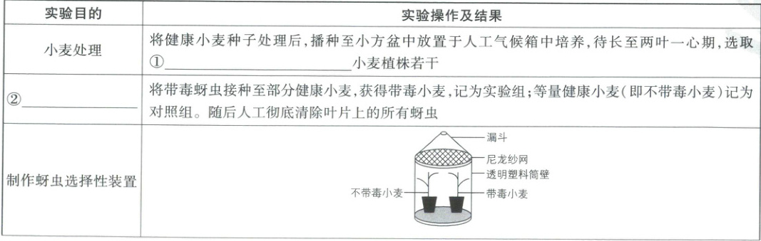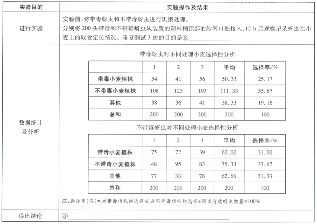 (4)①为了控制无关变量相同且适宜,将健康小麦种子处理后,播种至小方盆中放置于人工气候箱中培养,待长至两叶一心期,选取长势基本一致的健康小麦植株若干(关键点:保证无关变量一致)。②设置实验组和对照组(实验分组),将带毒蚜虫接种至部分健康小麦,获得带毒小麦,记为实验组;等量健康小麦(即不带毒小麦)记为对照组。随后人工彻底清除叶片上的所有蚜虫。③重复测试3次的目的是减小实验误差。④根据带毒蚜虫对不同处理小麦选择性分析,可以得出带毒蚜虫更偏好在健康小麦上取食;根据不带毒蚜虫对不同处理小麦选择性分析,可以得出不带毒蚜虫对小麦是否感染病毒选择性不明显。