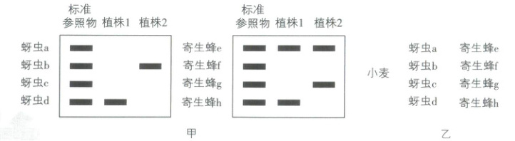 由电泳结果可知,植株1上有蚜虫d和寄生蜂e、h,