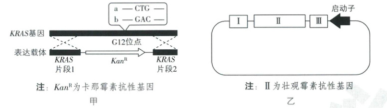 ②结合图甲可知,KRAS基因两端与表达载体中KanR两侧的序列相同,G12突变位点所在的一段序列可替换成卡那霉素抗性基因,因此将针对KRAS基因设计的表达载体导入结肠癌细胞后,需要鉴定同源重组是否成功,应在含有卡那霉素的培养液中培养,筛选出转基因癌细胞。