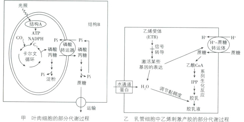 (2)据图甲可知,Pi由细胞质基质向叶绿体运输与磷酸丙糖由叶绿体基质向细胞质基质运输属于协同转运。当缺磷时,会影响磷酸丙糖转运出叶绿体,还会影响ATP和NADPH等物质的合成,从而抑制光合作用,进而影响胶乳再生。