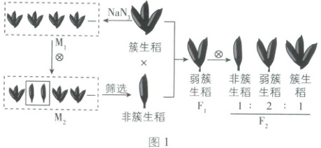 21. (11 分)我国科研人员用叠氮化钠($NaN_3$)处理簇生稻(有三个籽粒簇生在一起)种子,获得大量突变株($M_1$),并从 $M_1$ 自交后代 $M_2$ 中筛选出 2 个非簇生稻突变体株系开展相关研究,部分流程如图 1 所示。请回答下列问题。