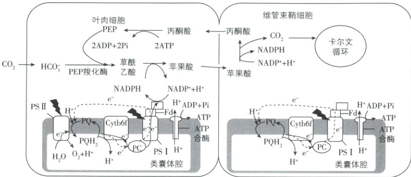 (2)PEP 羧化酶与 $CO_2$ 的亲和力远高于 R 酶,可催化低浓度的 $CO_2$ 与图中