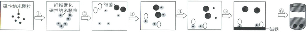 B.过程③中纤维素化磁性纳米颗粒对细菌有高亲和力,有利于纤维素化磁性纳米颗粒黏附细菌