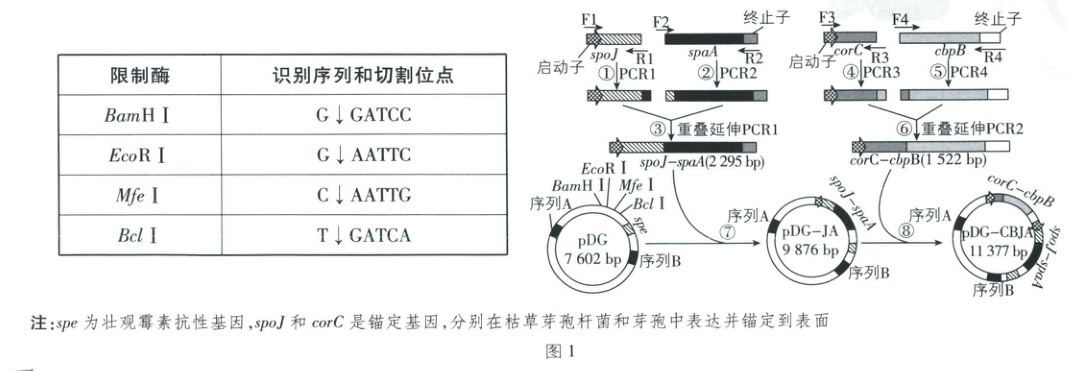 24.(12 分)红斑丹毒丝菌是猪的病原性细菌(引起猪丹毒),其表面抗原 A 蛋白(SpaA)和胆碱结合蛋白 B(CbpB)能诱导猪等产生特异性抗体。枯草芽孢杆菌是一种益生菌,为猪丹毒口服活载体疫苗的研发奠定基础。研究人员构建重组质粒(过程如图 1)导入枯草芽孢杆菌,一段时间后分别收集菌体和芽孢(抗逆性强,适宜条件下能萌发形成菌体),制备菌体表面表达 SpaA 的重组菌体活载体疫苗、芽孢表面表达 CbpB 的重组芽孢活载体疫苗,并通过小鼠免疫实验评价免疫效果。请回答下列问题。