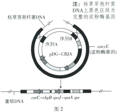 ,若同时进行,酶切后再连接得到的连接产物多。(3)将重组质粒 pDG - CBJA 导入枯草芽孢杆菌,将发生如图 2 所示的同源重组过程,pDG 中的序列 A、序列 B 的设计依据是