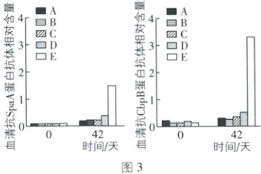 (5)科研人员研究了不同疫苗体液免疫应答的效果,结果如图 3,A 组为磷酸缓冲液,B 为野生型枯草芽孢杆菌菌体,C 组为野生型枯草芽孢杆菌芽孢,D 为重组枯草芽孢杆菌菌体活载体疫苗,E 组为重组枯草芽孢杆菌芽孢活载体疫苗。