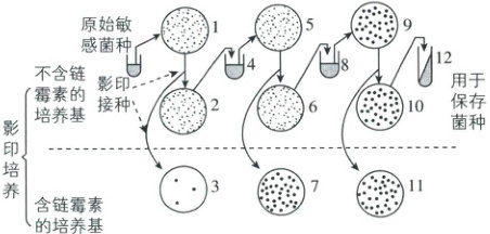 思路分析 本实验用影印培养法探究大肠杆菌抗药性的形成与环境的关系,原始敏感菌种正常接种到不含链霉素的培养基进行培养,长出菌落后,分别影印到不含链霉素的培养基和含有链霉素的培养基中,并在不含链霉素的培养基中选取能在含链霉素培养基上生长的对应位置的菌落,进行进一步的培养,如此重复几次,因为每次都是选取可以在含链霉素培养基上生长的菌落,所以多次筛选之后,在含链霉素培养基上生长的菌落会增多。
