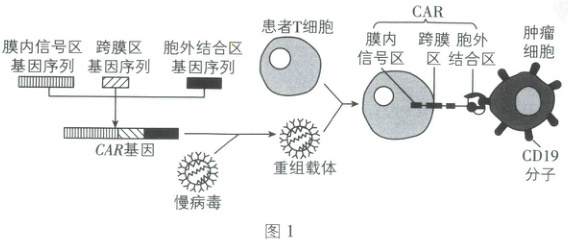 (2)由图1分析可知,CAR蛋白由三部分构成,分别为膜内信号区、跨膜区和胞外结合区,胞外结合区主要与肿瘤细胞表面分子(CD19)结合,起识别肿瘤细胞的作用。跨膜区除了将CAR蛋白锚定于T细胞表面外,还负责将胞外信号传递给膜内信号区,诱导T细胞发生相应变化,膜内信号区调控CAR−T细胞的相关基因进行选择性表达,促进CAR−T细胞的增殖、分化,从而增强对肿瘤细胞的特异性杀伤和记忆。