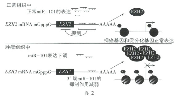 (3)在正常组织和肿瘤组织中 miR-101 调节 EZH2 基因表达的过程如图 2 所示。