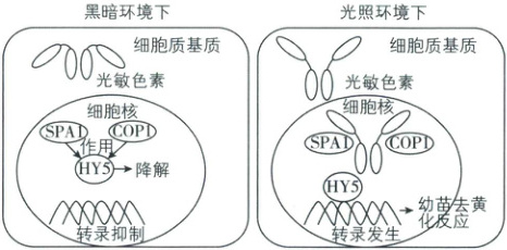 [深度解析]光敏色素是一类蛋白质(色素一蛋白复合体),分布在植物的各个部位,其中在分生组织的细胞内比较丰富。在受到光照射时,光敏色素的结构会发生变化,这一变化的信息会经过信息传递系统传导到细胞核内,影响特定基因的表达,从而表现出生物学效应。A正确;由图可知,黑暗环境下与光照环境下光敏色素的结构不同,推测其接受光信号后,空间结构会发生变化,影响特定基因的表达,B正确;光照环境下,进入细胞核的光敏色素抑制HY5降解,HY5影响特定基因的表达,使幼苗发生去黄化反应,C错误;光敏色素分布在细胞质中,可以转化光信号,有利于光合作用的进行,D正确。