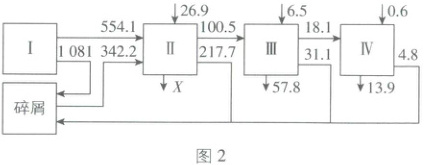 (4)图2为能量流动示意图,对于第二营养级而言,其同化量=呼吸作用消耗量+用于生长、发育和繁殖的能量=923.2(J·cm⁻²·a⁻¹),流向下一营养级的能量为100.5J·cm⁻²·a⁻¹,流向碎屑的能量为217.7J·cm⁻²·a⁻¹,X表示营养级生物呼吸作用散失的能量为923.2−100.5−217.7=605(J·cm⁻²·a⁻¹)。第四营养级同化的能量来自第三营养级的能量为18.1J·cm⁻²·a⁻¹,第三营养级的同化量为100.5+6.5=107(J·cm⁻²·a⁻¹),则这两个营养级之间的能量传递效率为18.1÷107×100%≈16.9%。