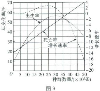 (5)秦淮河禁渔期结束后,为了合理开发渔业资源,研究人员对某种大型鱼的种群出生率、死亡率及增长速率的动态关系研究后,若得出图 3 的数学模型,则据图分析,当种群数量为 3 500 条时,为保证种群持续获得较大的产 量,当年该鱼的捕捞量约为