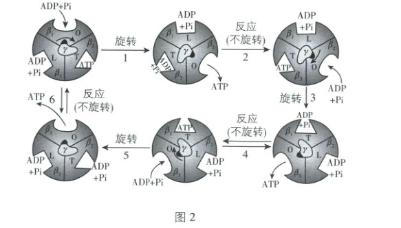 (3)ATP 合酶的结构与功能如图 2 所示。$\beta$亚基有$\beta_1$~$\beta_3$三个催化位点,每个位点可呈现三种构象,O 为开放构象,T 为紧密构象,L 为松弛构象,其中