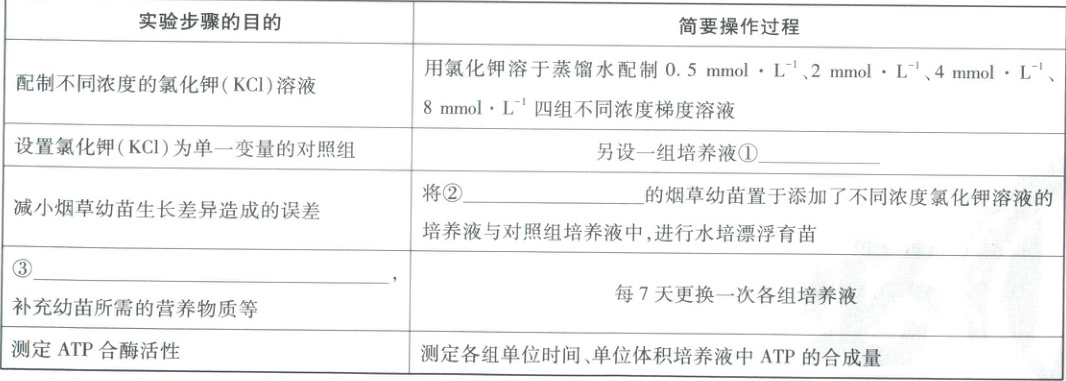 (4)ATP 合酶的构象变化会影响其相关功能。为研究氯化钾(KCl)对烟草 ATP 合酶活性的影响,科研人员采用水培漂浮育苗方法进行了有关实验,具体操作如下,请完善表格内容。