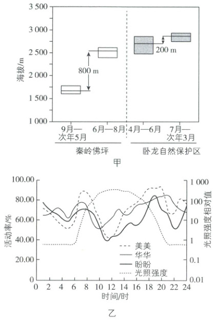 (2)据图甲可知,秦岭佛坪与卧龙自然保护区的大熊猫具有(填“相同”或“不同”)的季节性运动模式,推测大熊猫季节性迁移的影响因素有等,对圈养大熊猫进行野化放归时需要考虑这些因素。