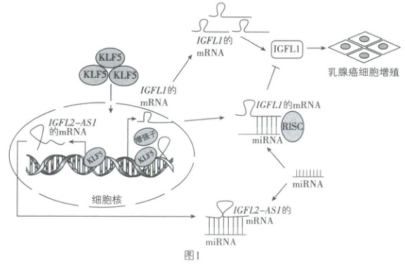 22. (11 分)我国科学家在研究乳腺癌过程中发现蛋白质类的转录因子 KLF5 能诱导乳腺癌细胞中$IGFL2 - AS1$和$IGFL1$基因转录,同时$IGFL2 - AS1$可通过 miRNA 调控$IGFL1$的表达,促进肿瘤细胞的增殖和生长,作用机制如图 1 所示。miRNA 是真核生物中广泛存在的一种小分子 RNA,可调节其他基因的表达。