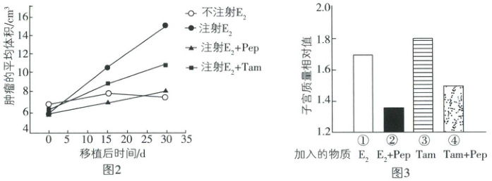 (5)雌激素作用于子宫,会引起子宫增大。Tam 也能作用于子宫,有引起子宫增大的副作用。科研人员探究了 Pep 对该过程的影响,结果如图 3 所示,说明了 Pep 能(填“加强”或“缓解”)$E_2$和 Tam 引起子宫增大的作用。