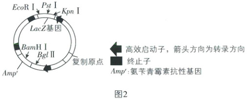 ②EcoRⅠ、KpnⅠ(2分) 白 重组质粒中LacZ基因被破坏,宿主菌无法合成β-半乳糖苷酶,不能分解X-gal,菌落呈白色,且双酶切可以保证目的基因正向连接(2分)