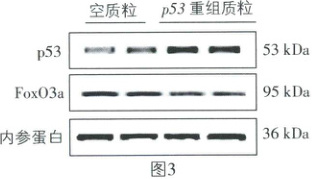 (3)研究发现 FoxO3a 是 p53 的下游信号蛋白,在细胞内过量表达 FoxO3a 可减轻 p53、β - 半乳糖苷酶和一些炎性因子相关指标的表达,改善视网膜细胞衰老。将含 p53 的载体导入视网膜细胞后,细胞内 p53、FoxO3a 的表达水平如图 3 所示,说明 p53 加重 M 诱发的小鼠视网膜细胞衰老的机制为 (2 分)。