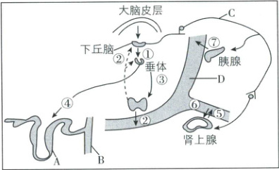 17.如图是下丘脑参与调节内环境稳态的模式图,其中①~⑦表示相关激素,A~D 表示相关结构。相关叙述错误的有
